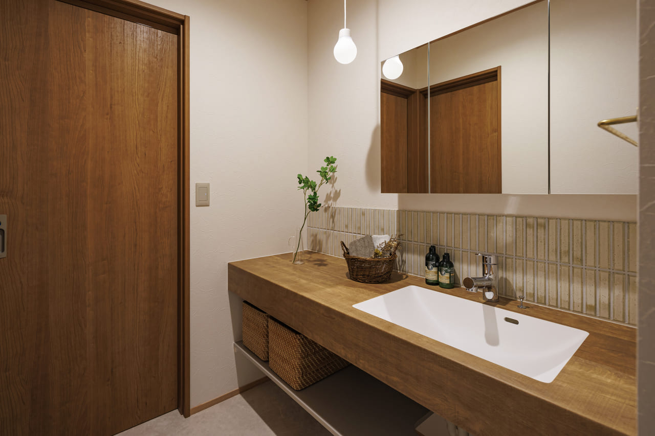 自慢したくなるような、清潔さとデザイン性を兼ね備えたオリジナル洗面化粧台。
