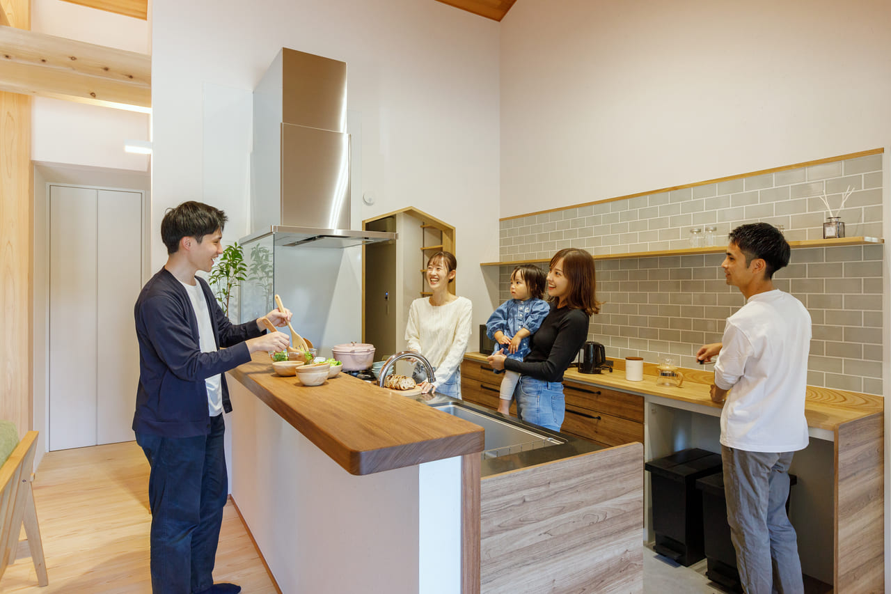 もし、食べる時だけが楽しみならば、それはもったいないかもしれません。こちらのお家は、食材を買ってきた時、料理を作る時、食器を片付る時、どんな時も家族全員が参加しやすく、同じ時間を共有しやすい間取りになっております。家事を無くすのではなく、家事を家族と楽しむきっかけにする。そんな、お家だからこそ、毎日が笑顔で溢れていると思います。