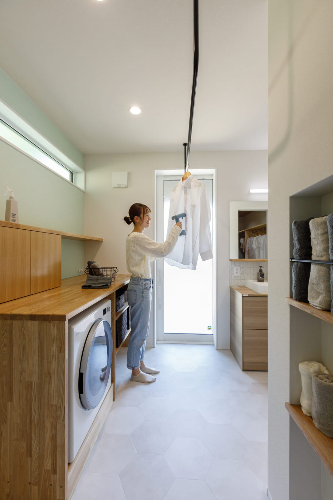 外干しの際は、ランドリー室から直接出入りできる勝手口からすぐに、外干しスペースがあります。室内干しの際は、ガス衣類乾燥機「乾太くん」を利用することで、外干しのような仕上げりでできます。また、大容量のWICを併設しているため、乾いた洗濯物もすぐに収納。数歩で完結する家事ラク動線をお試しくださいませ。