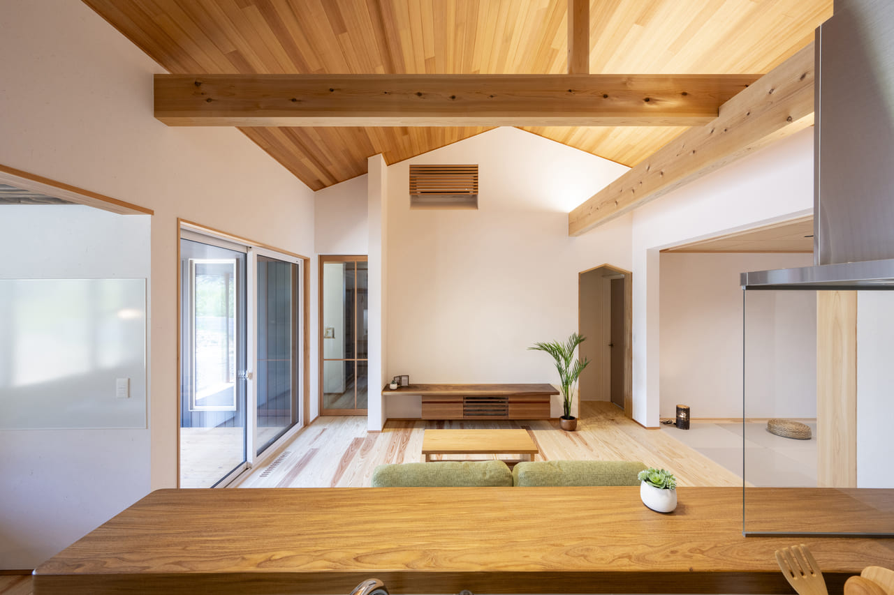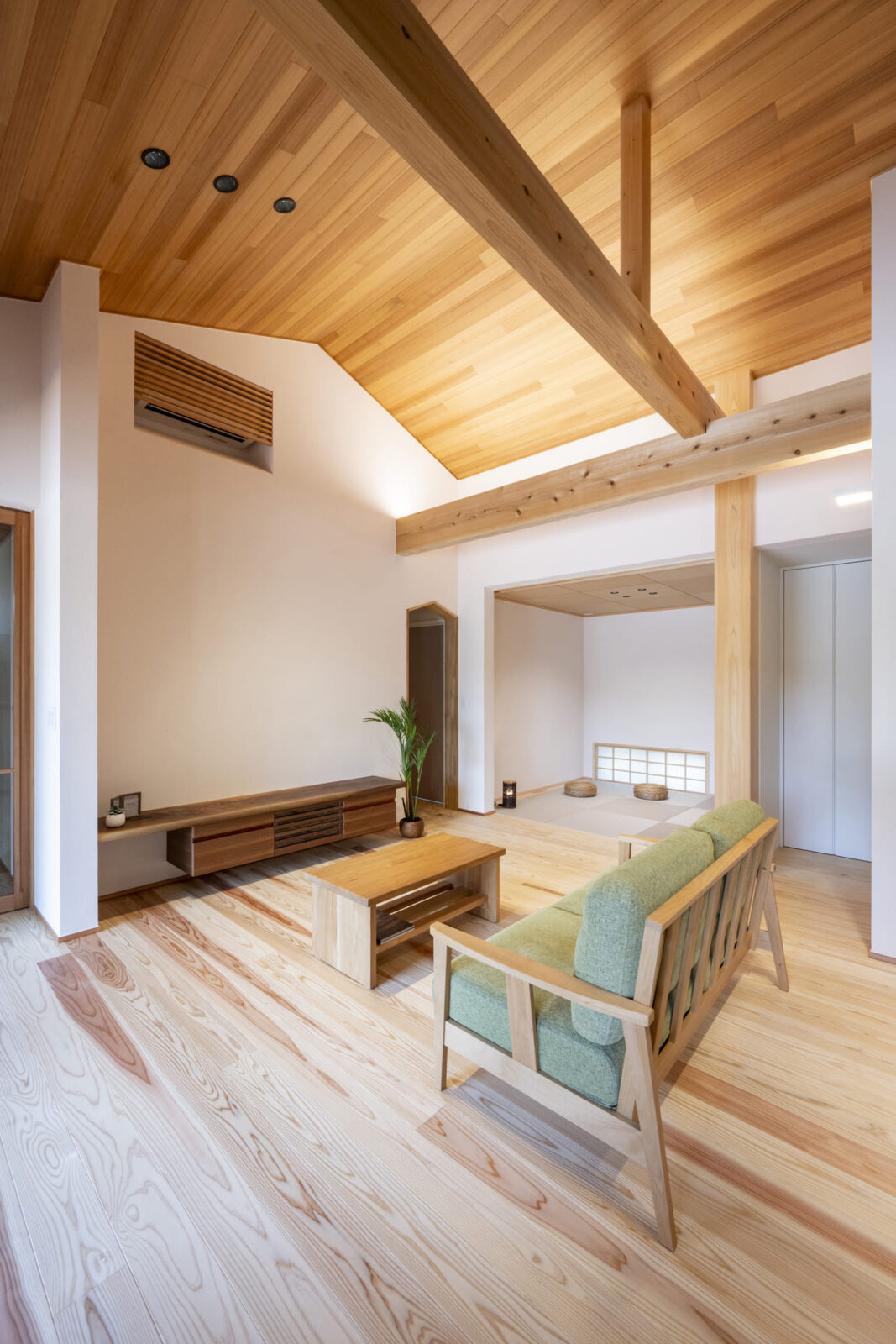 吉野杉とは奈良県吉野地方より産出されている高品質な杉材です。年輪幅が狭く均一、杉特有の赤身と白太のコントラストも美しいため、上品な雰囲気を感じられます。そんな吉野杉を天井一面に張らせていただいたリビング。ソファーに座って眺めると圧巻です。ぜひ、この機会にお試しいただきたいポイントです。