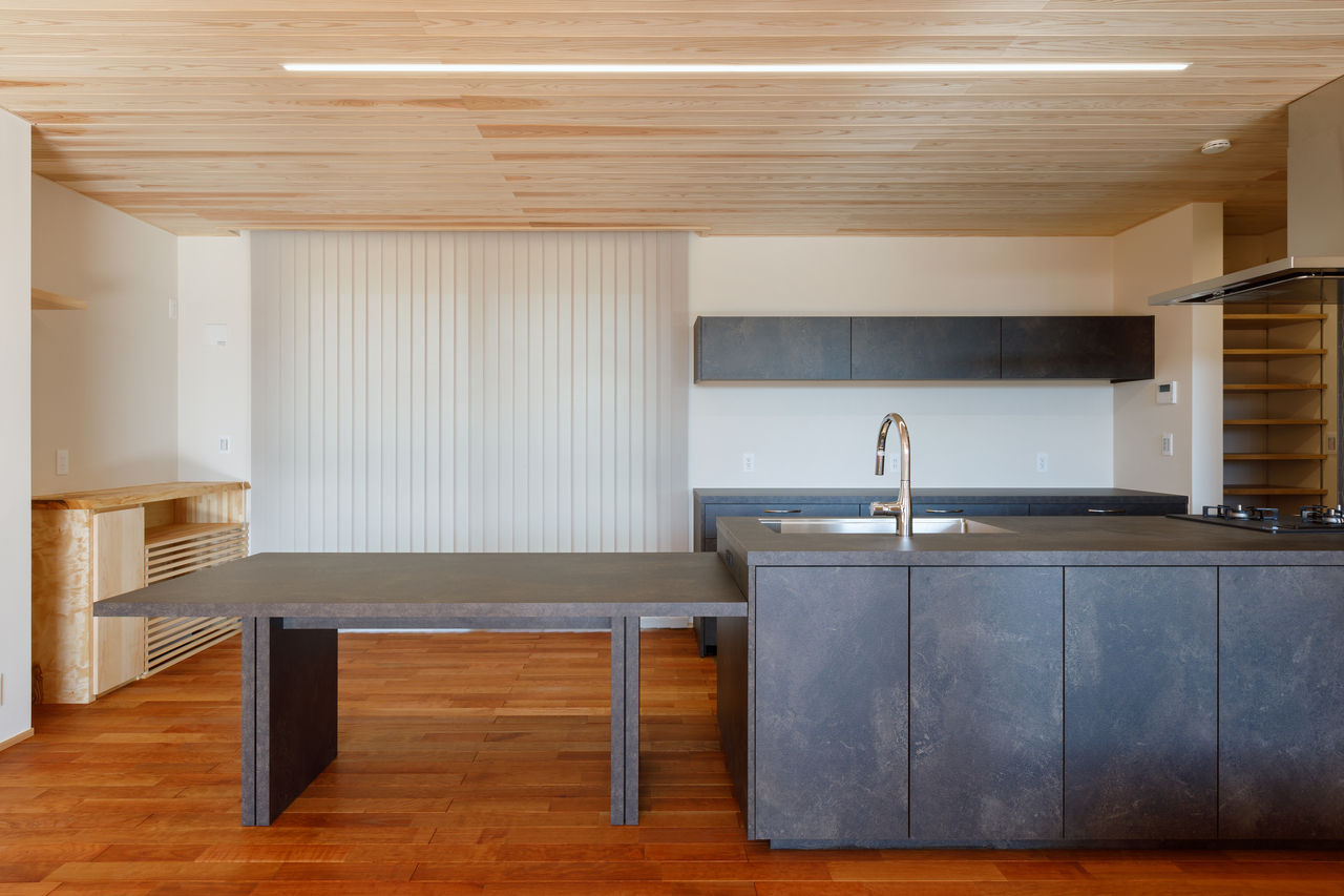 キッチンにはGRAFTEKTの塊感あるブラックを採用し、ダイニングテーブルも同系色で統一。水平ラインを意識した、すっきりと美しい空間に仕上げました。