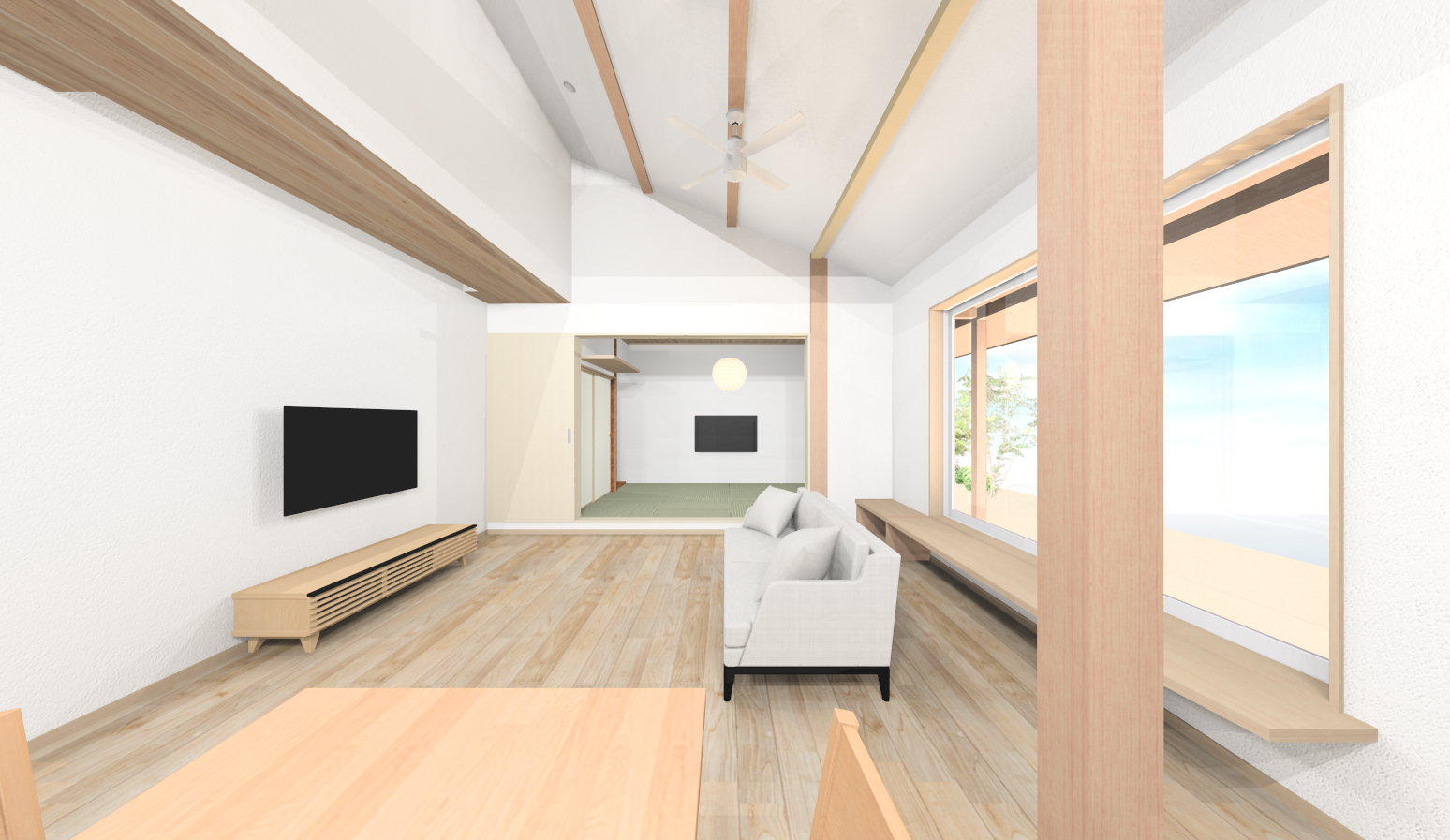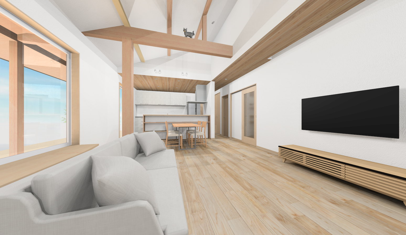 空へと広がる勾配天井と、景色を切り取る大窓。3.6mの「窓ベンチ」は家族の特等席。
